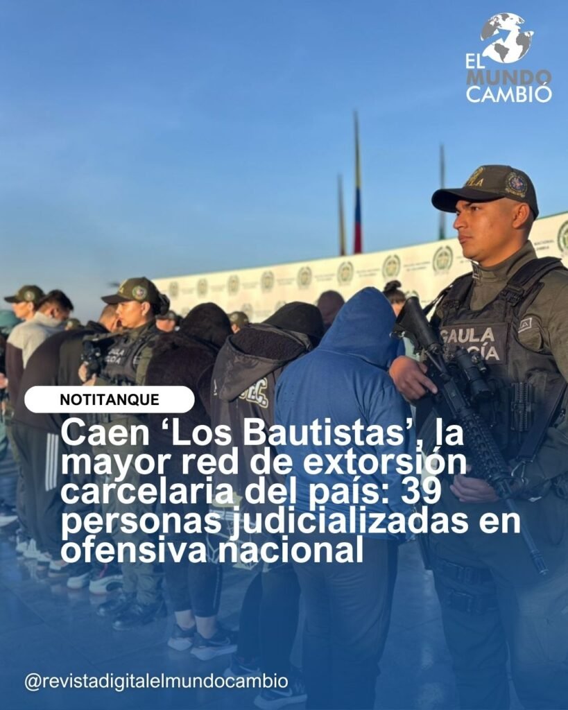 En una de las operaciones más contundentes contra la extorsión carcelaria en Colombia, la Policía Nacional, a través del Grupo de Acción Unificada para la Libertad Personal (GAULA) y en articulación con la Fiscalía General de la Nación, logró la captura de 33 personas y la imputación de cargos a 6 más, integrantes de la estructura criminal conocida como ‘Los Bautistas’, señalada de ser la red de extorsión digital más grande del país.