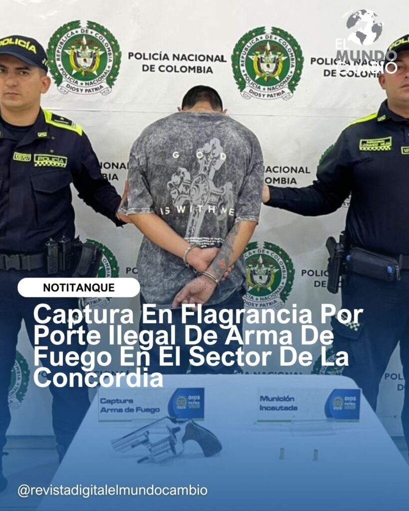 El procedimiento se registró en la calle 55 con carrera 18, barrio La Concordia, lugar donde los uniformados ejecutaban actividades preventivas y operativas orientadas a fortalecer la seguridad y la convivencia ciudadana. Durante la intervención, los policías abordaron al sujeto y, al practicarle un registro a persona, le fue hallado un (01) arma de fuego tipo revólver, junto con dos cartuchos, motivo por el cual se procedió a su captura.