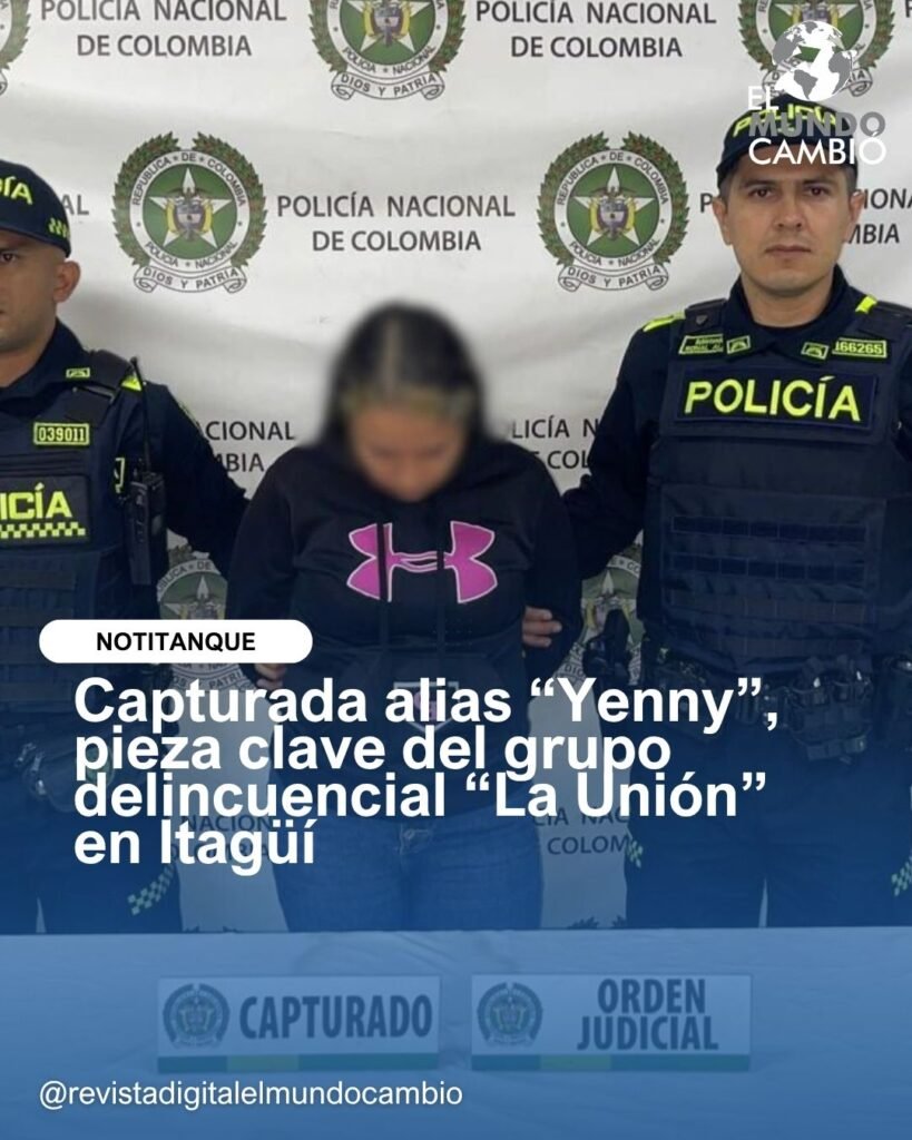 En un contundente operativo desarrollado por la Policía Nacional de Colombia, fue capturada alias “Yenny”, presunta integrante del grupo delincuencial organizado “La Unión”, dedicado al tráfico de estupefacientes en el municipio de Itagüí.