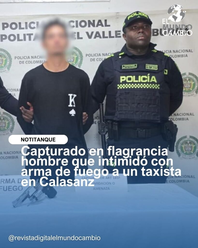 En desarrollo de los planes permanentes de patrullaje, vigilancia y control adelantados por la Policía Metropolitana del Valle de Aburrá, un hombre fue capturado en flagrancia luego de intimidar con un arma de fuego a un conductor de taxi, en hechos ocurridos en el barrio Calasanz, comuna 12 – La América, al occidente de Medellín.