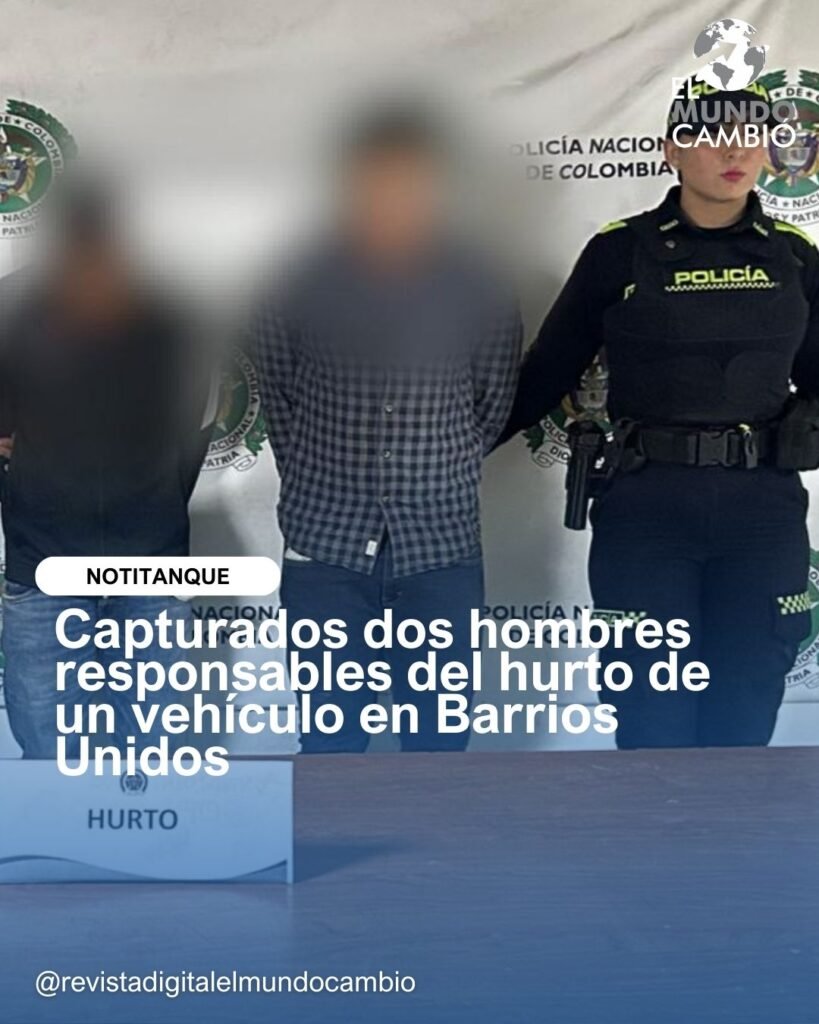 En el marco de la estrategia Seguridad, Dignidad y Democracia, uniformados de la Estación de Policía Barrios Unidos lograron la captura de dos hombres presuntamente responsables del hurto de un vehículo mediante intimidación con arma de fuego.