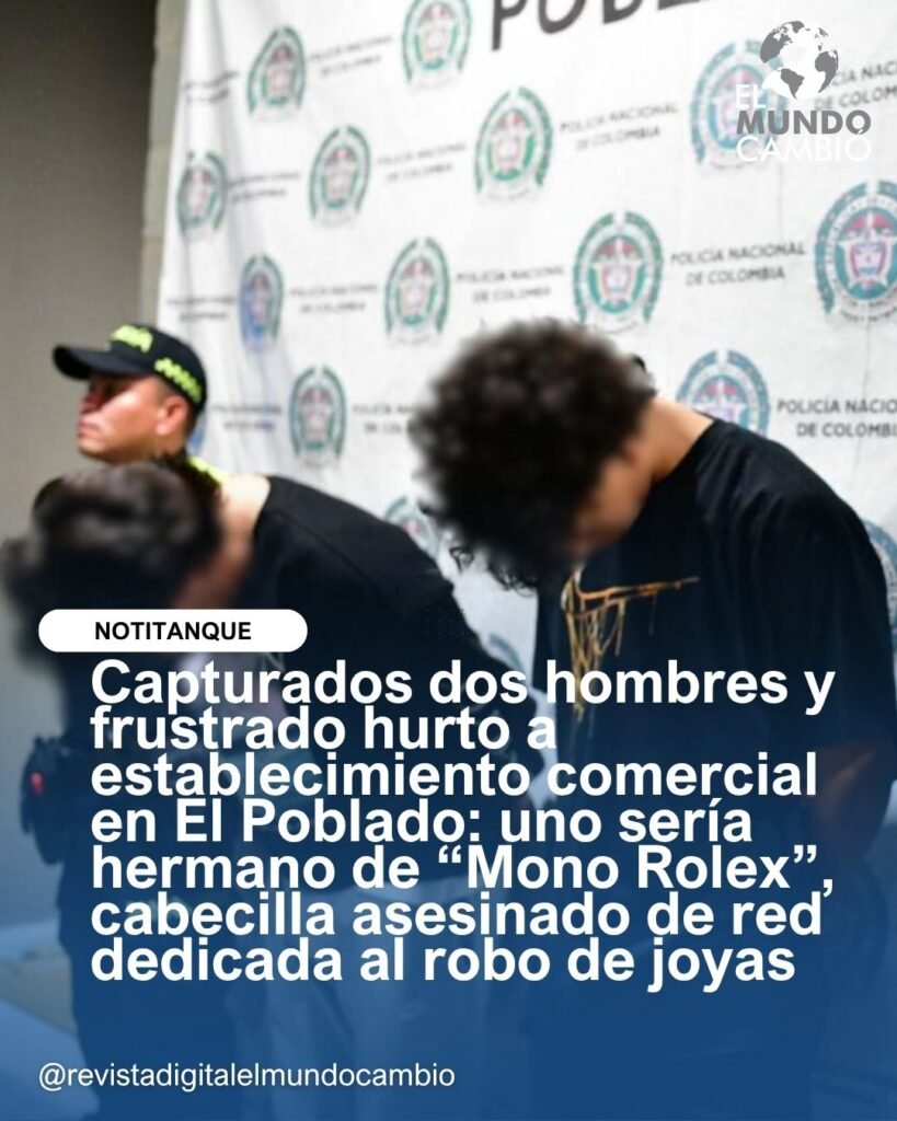 La rápida reacción de la Policía Nacional permitió frustrar un hurto que estaba siendo ejecutado en un establecimiento comercial del sector Parque de la Uva, en el barrio El Poblado, en Medellín. En los hechos fueron capturados dos hombres, de 21 y 30 años, señalados de intentar cometer el ilícito. Uno de ellos sería hermano de “Mono Rolex”, cabecilla asesinado de una estructura delincuencial reconocida por el hurto de joyas.