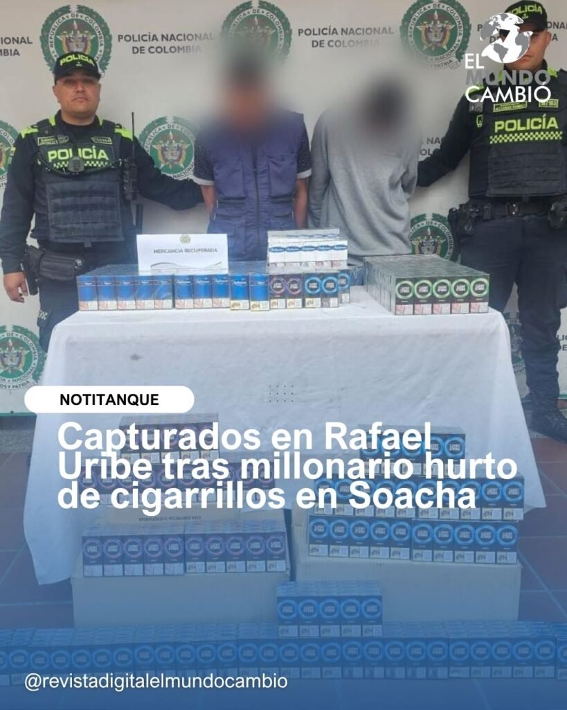En una rápida acción policial, uniformados del CAI Claret, adscritos a la Policía Metropolitana de Bogotá, lograron la captura de dos hombres de 24 y 42 años señalados de participar en el hurto de un cargamento de cigarrillos en el municipio de Soacha, Cundinamarca.