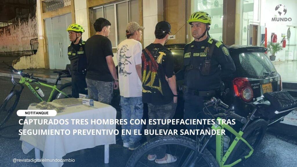 Bucaramanga, Santander. En el marco de la estrategia institucional “Yo creo en una Metropolitana bonita y segura”, la Policía Nacional, a través de unidades de la Fuerza Disponible del grupo BiciTerritorios, logró la captura en flagrancia de tres hombres de 28, 25 y 24 años por el presunto delito de tráfico, fabricación o porte de estupefacientes.