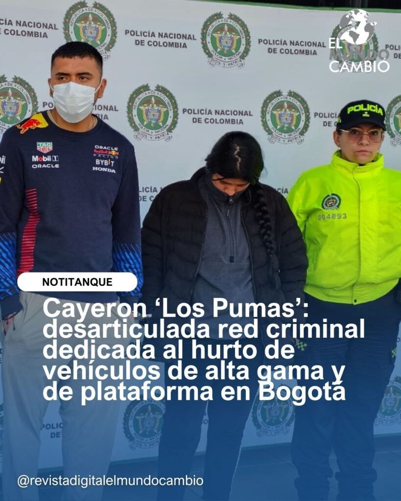 En el marco de la estrategia Seguridad, Dignidad y Democracia, la Policía Metropolitana de Bogotá, a través de la Seccional de Investigación Criminal y en trabajo articulado con la Fiscalía General de la Nación, logró la captura por orden judicial de doce personas que integraban el Grupo Delincuencial Común Organizado ‘Los Pumas’, dedicado al hurto de vehículos de alta gama y automotores utilizados en plataformas de transporte.