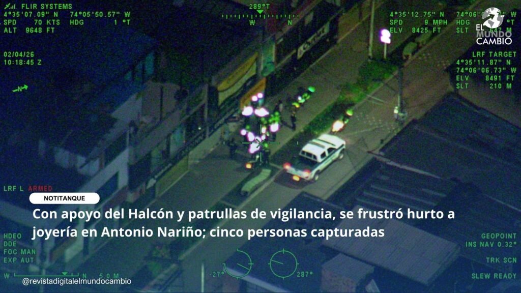 En el marco de las acciones para la protección del comercio y la convivencia ciudadana, la Policía Nacional de Colombia logró frustrar un hurto a una joyería ubicada en la localidad de Antonio Nariño, en Bogotá, mediante un operativo articulado que incluyó apoyo aéreo y patrullas de vigilancia.