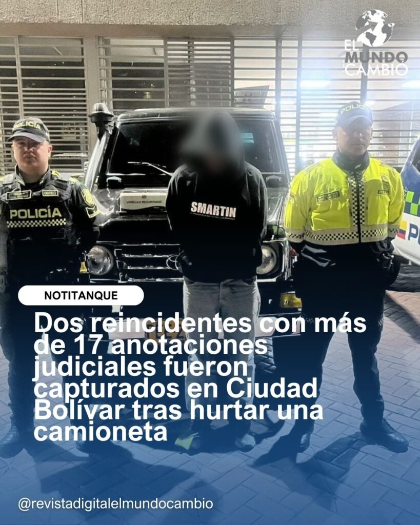 La Policía Nacional, a través de los uniformados del CAI Perdomo de la Metropolitana de Bogotá, logró un importante resultado operativo al capturar a dos hombres de 24 y 33 años, señalados de hurtar una camioneta minutos antes en el sur de la ciudad.