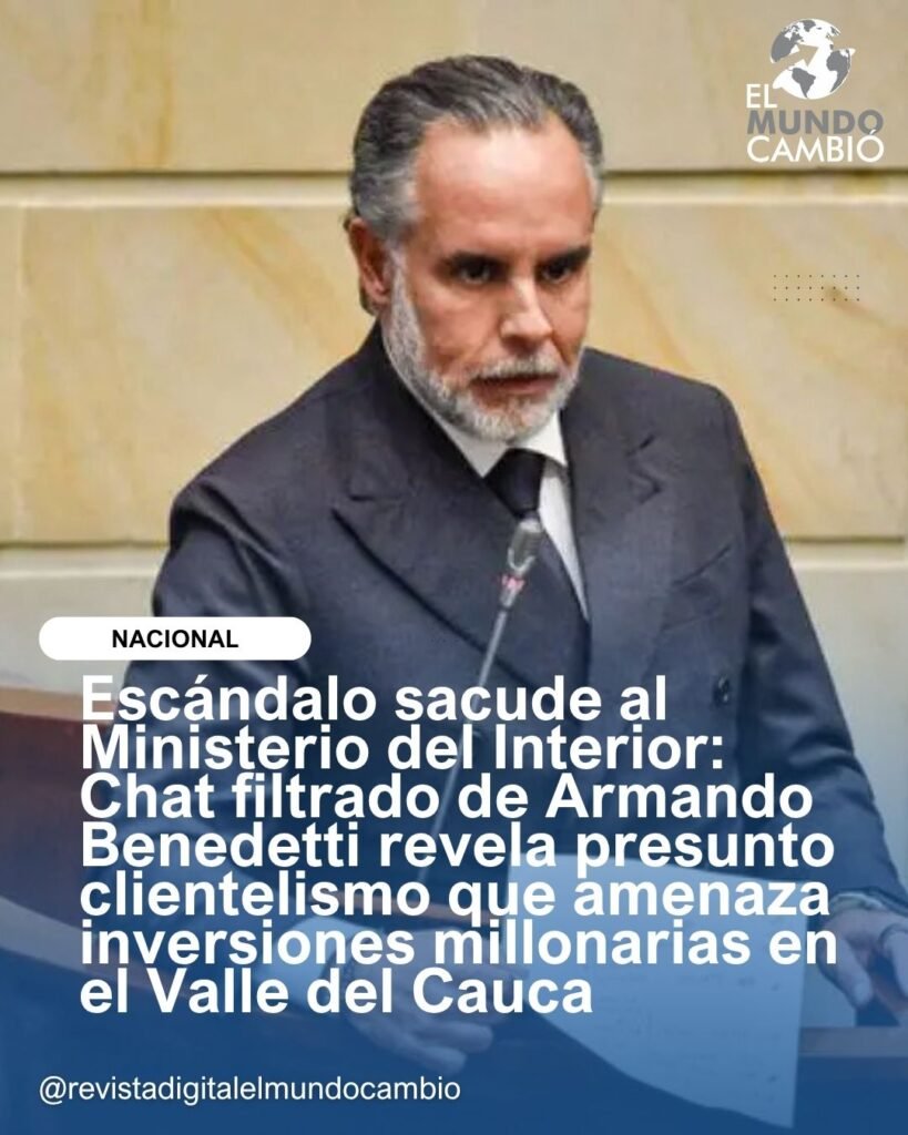 Un nuevo escándalo sacude al alto gobierno colombiano luego de la filtración de un chat atribuido al ministro del Interior, Armando Benedetti, que ha generado una profunda crisis institucional y una ola de rechazo ciudadano. El contenido del mensaje revela una posible maniobra de clientelismo político, en la que Benedetti sugiere frenar inversiones clave en el Valle del Cauca en represalia por decisiones políticas de la gobernadora Dilian Francisca Toro.