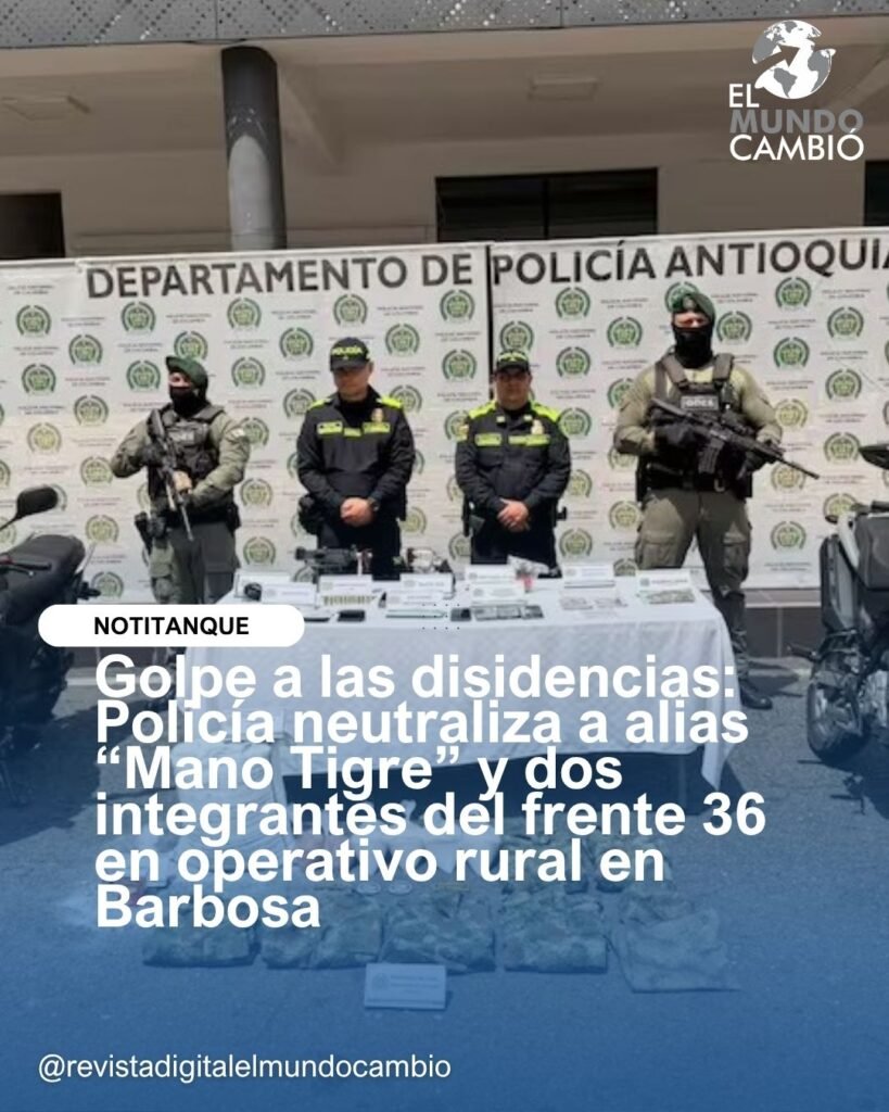 En una operación contundente contra los grupos armados ilegales, la Policía Nacional de Colombia, en coordinación con la Fiscalía General de la Nación, neutralizó a tres presuntos integrantes del frente 36 de las disidencias de las FARC, en zona rural del municipio de Barbosa, norte del Valle de Aburrá. Este resultado representa uno de los golpes más importantes contra esta estructura criminal en los últimos meses.