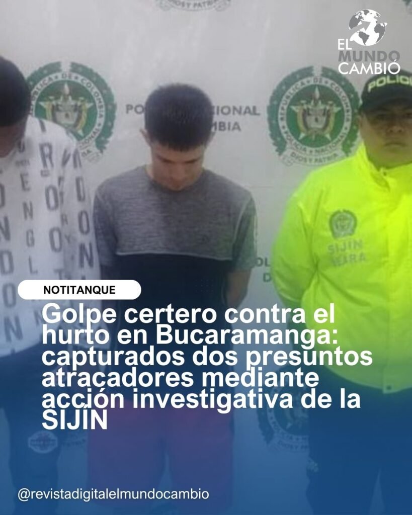 El resultado fue obtenido gracias al trabajo especializado del Grupo Contra Atracos, en desarrollo del Plan Cazador, una estrategia enfocada en identificar, ubicar y judicializar a los responsables de hurtos violentos que afectan a la comunidad. Tras un proceso investigativo riguroso, los uniformados lograron ubicar y capturar a Juan Sebastián Huertas, de 20 años, y Miguel Enrique Álvarez, de 21 años, en el barrio Bavaria II, al norte de la capital santandereana.