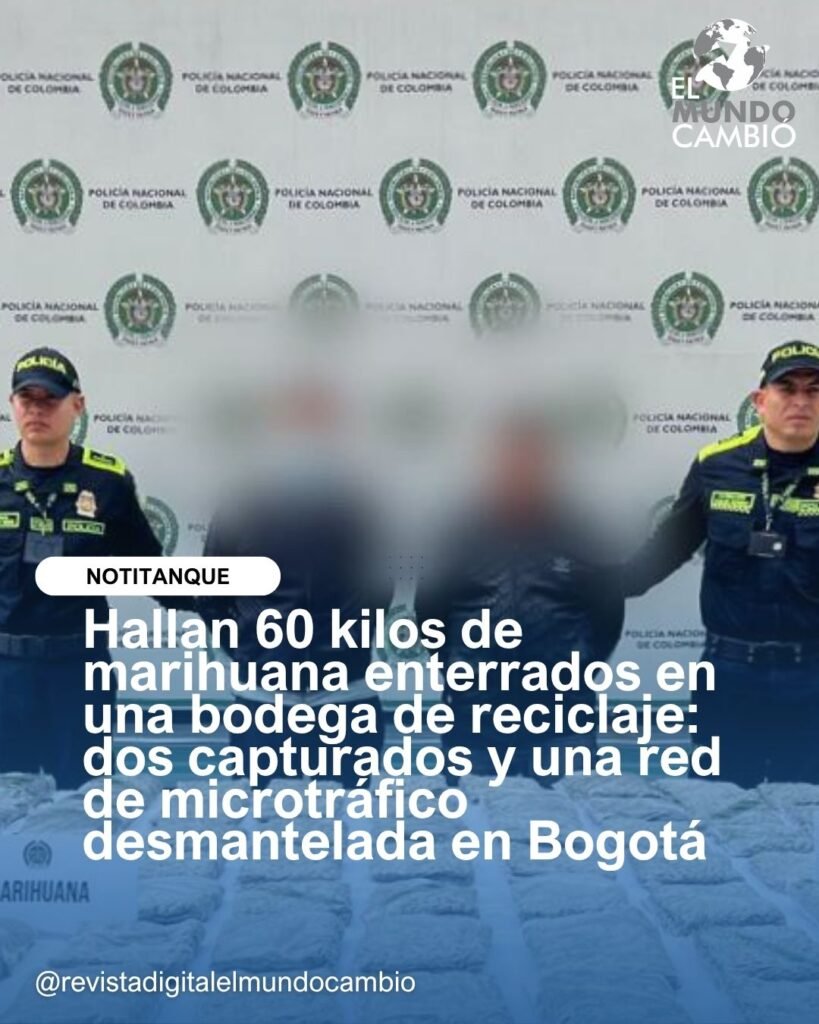 Una operación de alto impacto permitió a la Policía Metropolitana de Bogotá descubrir cerca de 60 kilogramos de marihuana ocultos bajo tierra dentro de una bodega de reciclaje, desarticulando así una estructura criminal dedicada al tráfico de estupefacientes que operaba en el sur de la ciudad.