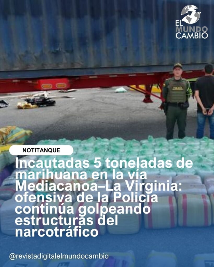 En un operativo desarrollado sobre la vía que conecta Mediacanoa con La Virginia (Risaralda), la Policía Nacional logró la incautación de cinco toneladas de marihuana, ocultas dentro de un tractocamión que transportaba artículos de aseo. El vehículo cubría la ruta entre Cali y Medellín, dos de los principales corredores logísticos del país, lo que indica un uso estratégico de rutas comerciales legales por parte de redes narcotraficantes.