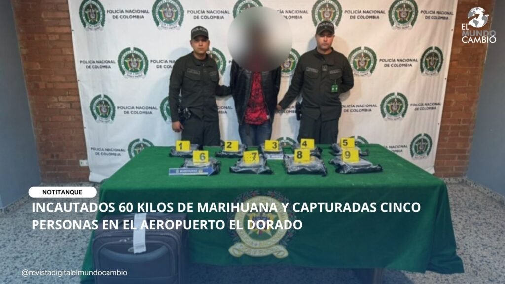 Bogotá, D.C. En el marco de la estrategia Esmeralda Plus, la Policía Nacional, a través de la Dirección de Antinarcóticos, logró la incautación de 60 kilogramos de marihuana en el Aeropuerto Internacional El Dorado, así como la captura de cinco personas presuntamente vinculadas a este hecho.