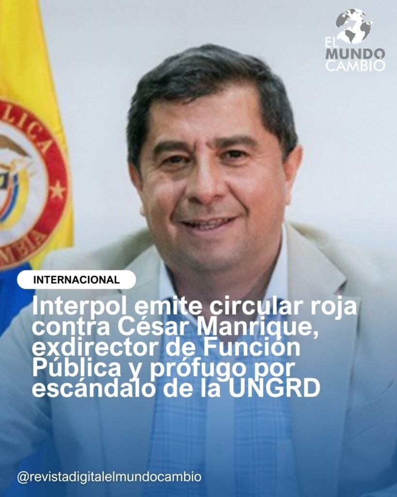 La Fiscalía General logró que la Secretaría General de Interpol, con sede en Lyon (Francia), emitiera una circular roja contra César Augusto Manrique Soacha, exdirector del Departamento Administrativo de la Función Pública. La medida busca hacer efectiva la orden de captura en su contra, emitida por una jueza penal de control de garantías el pasado 29 de julio, en el marco del caso de corrupción en la Unidad Nacional para la Gestión del Riesgo de Desastres (UNGRD).