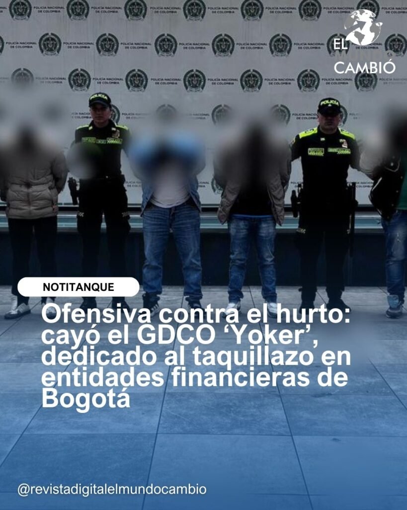 En el marco de la estrategia Seguridad, Dignidad y Democracia, la Policía Metropolitana de Bogotá, a través de la Seccional de Investigación Criminal (SIJIN) y en articulación con la Fiscalía General de la Nación, logró un importante golpe contra la delincuencia organizada con la captura mediante orden judicial de siete personas y la imputación de dos más que actualmente se encuentran en centro carcelario, señaladas de pertenecer al Grupo Delincuencial Común Organizado ‘Yoker’, dedicado al hurto a entidades financieras bajo la modalidad de taquillazo.