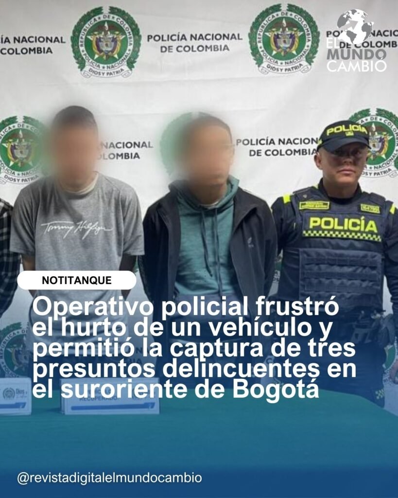 Gracias a la oportuna acción de las patrullas de vigilancia, la Policía Metropolitana de Bogotá logró frustrar el hurto de un vehículo y capturar en flagrancia a tres hombres de 19, 20 y 24 años, en hechos ocurridos en el barrio Nueva España, al suroriente de la capital.