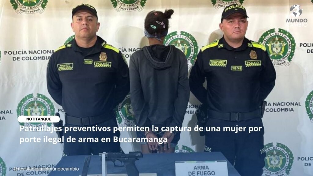 En el marco de la estrategia institucional “Yo creo en una Metropolitana Bonita y Segura”, la Policía Metropolitana de Bucaramanga, a través de unidades de las Zonas de Atención Policial (ZAP), logró la captura de una mujer de 38 años, de nacionalidad extranjera, por el delito de fabricación, tráfico, porte o tenencia de armas de fuego, accesorios, partes o municiones, en hechos registrados en el barrio Real de Minas, sobre la avenida Samanes.