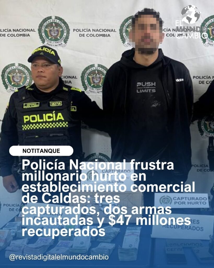 En una rápida y eficaz acción policial, la Policía Nacional frustró un millonario hurto que estaba siendo perpetrado en un establecimiento comercial del municipio de Caldas, dejando como resultado la captura de tres personas, la incautación de dos armas de fuego y la recuperación de 47 millones de pesos que los delincuentes pretendían llevarse.