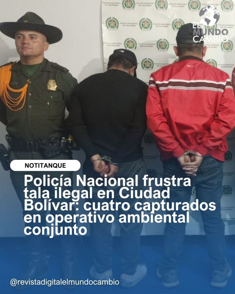 Bogotá D.C., octubre de 2025. La Policía Nacional de los colombianos, en el marco de la estrategia institucional “Seguros, Cercanos y Presentes”, desplegó un operativo focalizado contra los delitos ambientales que dejó como resultado la captura en flagrancia de cuatro personas en el barrio Paraíso, localidad de Ciudad Bolívar, quienes fueron sorprendidas mientras adelantaban actividades de tala ilegal de árboles tipo eucalipto.