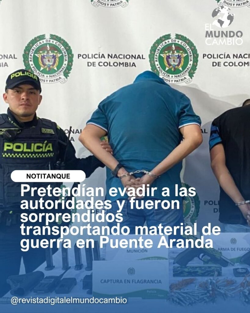 Las acciones preventivas y operativas adelantadas por la Estación de Policía Puente Aranda permitieron la captura de dos personas que transportaban ilegalmente armamento, municiones y material de uso privativo de las Fuerzas Militares. El operativo se desarrolló en el barrio Ejidos, donde la rápida reacción policial evitó que estos elementos continuaran su tránsito por la ciudad.