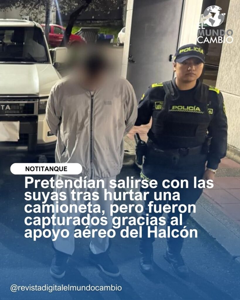 En una rápida y coordinada acción operacional, uniformados de la Estación de Policía Usaquén lograron la captura de dos hombres, de 24 y 32 años, señalados del hurto de una camioneta mediante la modalidad de atraco. La intervención contó con el apoyo estratégico del helicóptero Halcón, lo que permitió cerrar la huida de los responsables y recuperar el vehículo en cuestión de minutos.