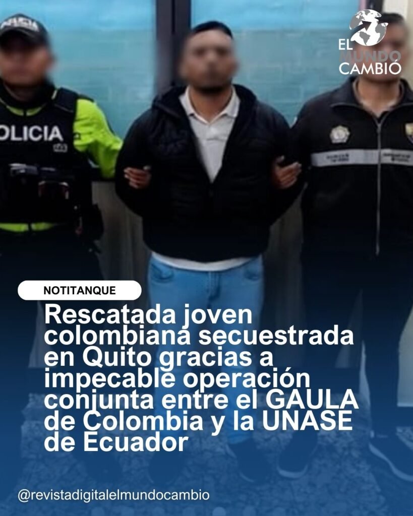 Un sobresaliente trabajo de cooperación entre el GAULA de la Policía Nacional de Colombia y la Unidad Nacional de Investigación Antisecuestro y Extorsión – UNASE de Ecuador permitió el rescate de una joven colombiana de 21 años, quien permaneció secuestrada durante más de una semana en la ciudad de Quito. La operación se llevó a cabo el pasado 17 de noviembre, como resultado de una rápida coordinación internacional y la activación inmediata del mecanismo CIPSE, la Comunidad Internacional Policial Contra el Secuestro y la Extorsión.
