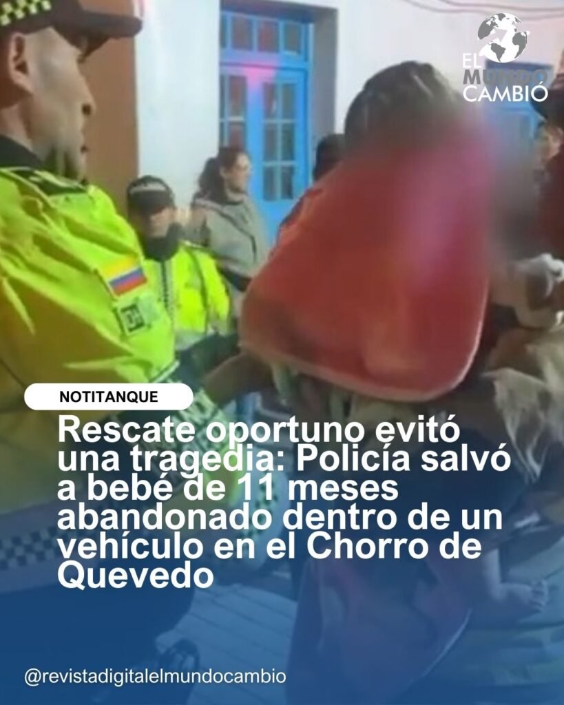 Una oportuna acción de la Policía Nacional permitió el rescate de un bebé de tan solo 11 meses que había sido dejado solo al interior de un vehículo estacionado en el sector del Chorro de Quevedo, en el corazón del centro histórico de Bogotá, un hecho que generó profunda preocupación entre transeúntes y residentes de la zona.