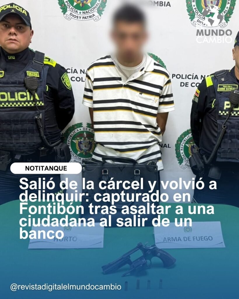 Bogotá, D.C. – La Policía Nacional de los colombianos, a través de las unidades de reacción de la Estación de Policía Fontibón, logró en las últimas horas la captura de un hombre de 27 años, señalado de cometer un asalto bajo la modalidad de fleteo minutos después de que una ciudadana realizara un retiro bancario.